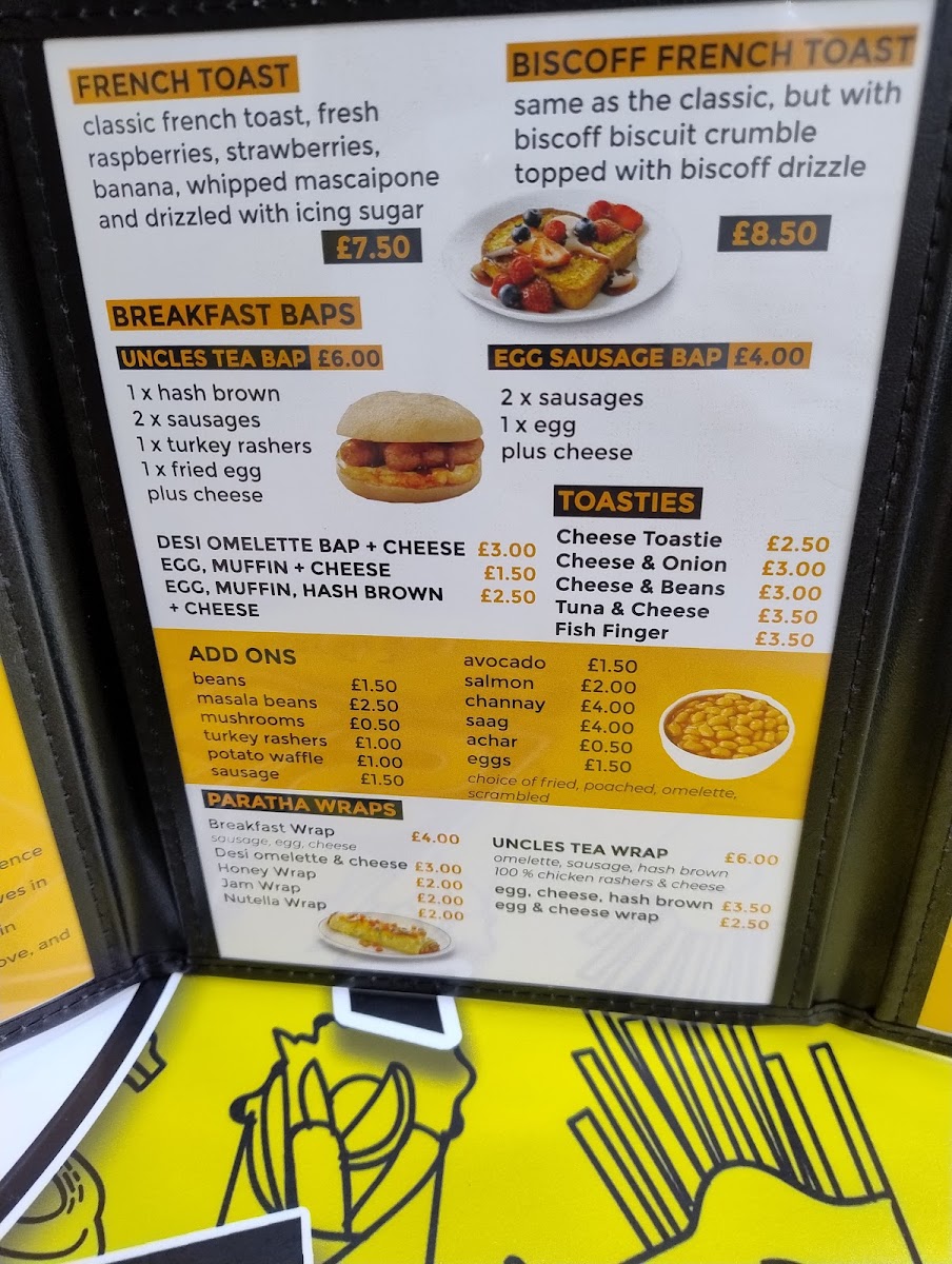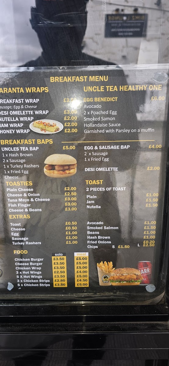 Welcome to Uncle's Tea Hut, a hidden gem nestled at 326 Lees Rd, Oldham. This delightful cafe offers a menu that merges comfort food with traditional flavors. The highlight is undoubtedly their wraps, such as the hearty Breakfast Wrap and the nostalgic Jam Wrap, priced just £2.00 to £3.00. If you're in the mood for something more substantial, the Chicken or Cheese Burger, both for £3.50, won’t disappoint.